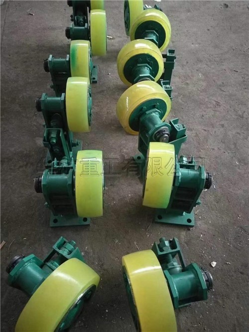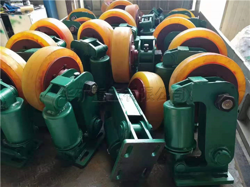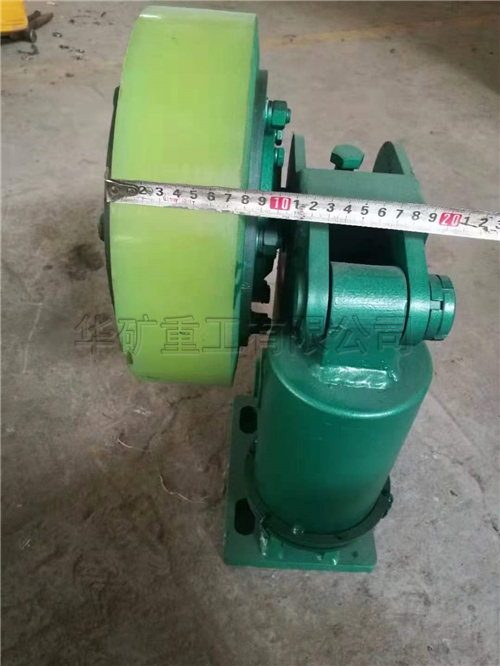 滾輪罐耳用于礦山提升容器的導(dǎo)向緩沖,本產(chǎn)品采用先進(jìn)的密封技術(shù),適應(yīng)淋水、煤塵等惡劣環(huán)境。輪頭安裝采用三鎖緊結(jié)構(gòu),避免掉輪頭事故的發(fā)生。滾輪采用四氫呋喃-環(huán)氧丙烷共聚醚型聚氨酯澆注,具有高彈性、耐撕裂、抗水性、抗油性的優(yōu)點(diǎn)。滾輪磨損補(bǔ)償調(diào)節(jié)采用左、右旋螺桿,調(diào)節(jié)迅速便捷。機(jī)座、擺架采用優(yōu)質(zhì)鋼板焊接成型,體積小、重量輕,安裝輕便。滾輪罐耳主要由輪軸、支架、緩沖裝置、底座等組成。