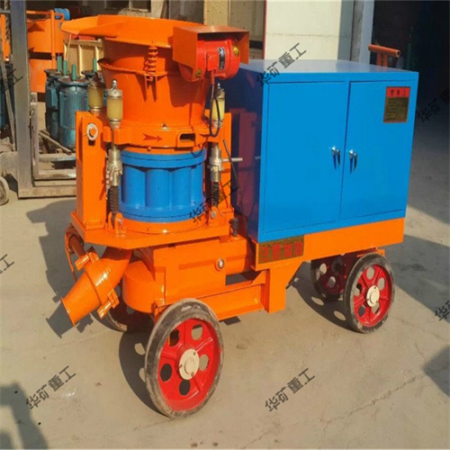 干式噴漿機(jī)簡稱干噴機(jī),是將一定比例的水泥、砂子及小石子均勻攪拌后,借助壓縮空氣為動力,使拌合料連續(xù)地沿著輸送管路被吹送到噴射嘴處。與來自壓力水箱的壓力水混合成為半濕的混凝土,以每秒80~100米的速度噴射到工作面上,使之達(dá)到襯砌的效果。噴射時,噴嘴一般距離工作面1米左右,一邊噴射,一邊慢慢畫圈移位。