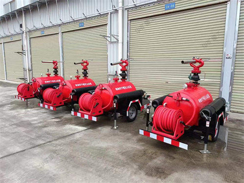 移動干粉滅火裝置,以高壓氮氣為動力,將儲罐內(nèi)干粉滅火劑通過干粉炮或干粉槍噴向保護對象,由于干粉的比重較大,在氣流的作用下能覆蓋到火上不致被氣流沖散。干粉在火焰的作用下破壞了原有的結(jié)晶,以新的化學(xué)物質(zhì)中斷了燃燒的鏈?zhǔn)椒磻?yīng),窒息火焰,同時干粉在分解過程中大量吸熱,使著火區(qū)域溫度迅速下降,從而控制撲滅火災(zāi)。